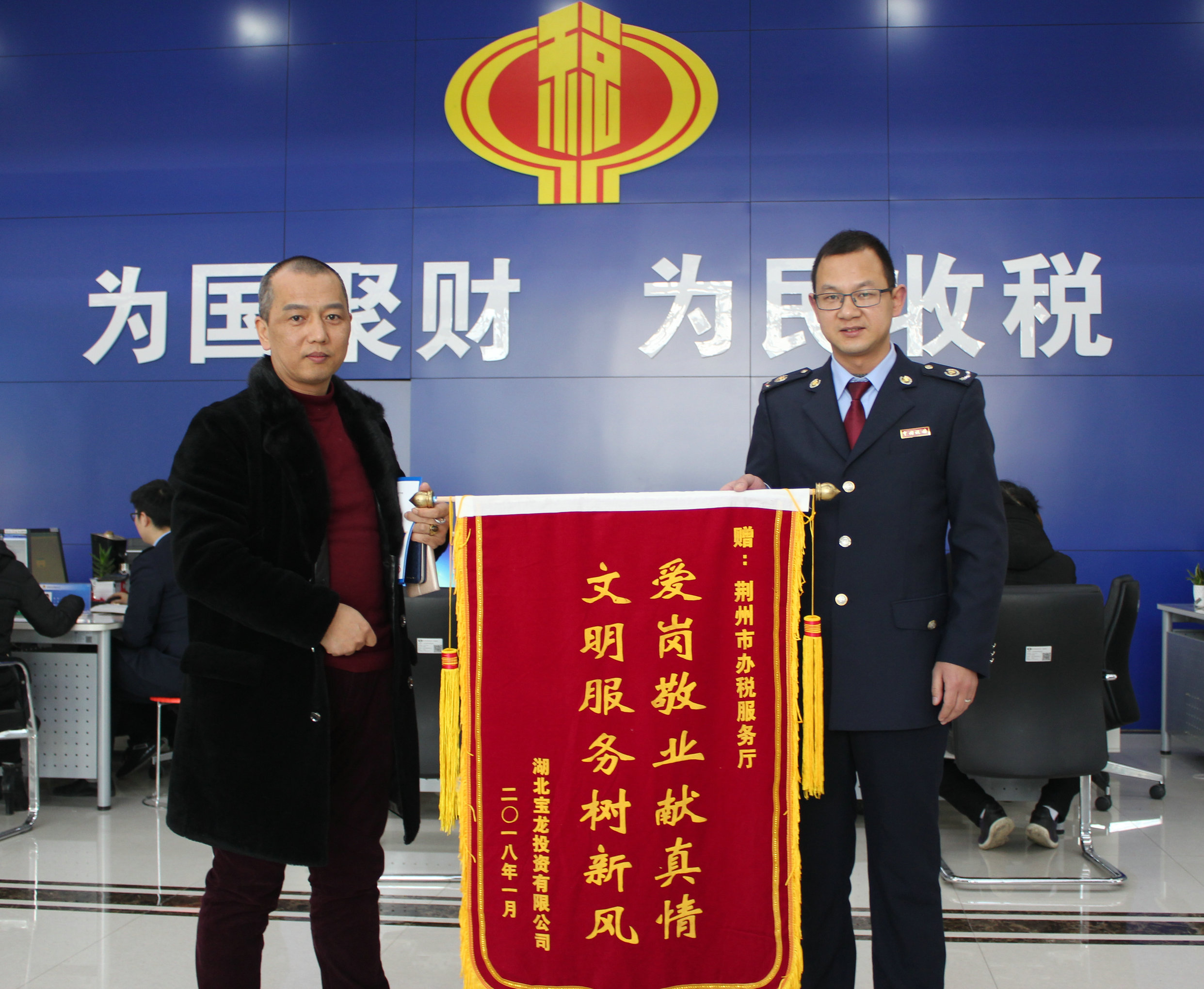 “上周六,你们的热情服务化解了我的燃眉之急,不然公司的一笔大业务就耽误了!今天特意过来向你们表示感谢!”1月8日上午,一名男子走进荆州市办税服务厅,将一面绣有“爱岗敬业献真情,文明服务树新风”的锦旗送给该厅负责人夏平。 原来,这位纳税人是湖北宝龙投资有限公司负责人罗杰。恰逢2017年最后一天,又是周末,该公司有一笔业务需当天为客户开具发票,而公司会计临时有事,罗杰还没曾来过办税服务厅办理过税收业务,正为此事犯愁。在QQ群里得知荆州市办税服务厅周末有人值班,他便抱着试一试的心态来到大厅。令其欣喜的是,工作人员很快为他办理了票种核定、金税盘发行、发票领用等业务,鉴于其是新成立不久的公司,大厅工作人员还带他到自助办税区辅导发票开具,告之金税盘使用方法及注意事项,并利用午休时间为他解答了其他涉税事项。 荆州市办税服务厅一直秉承“服务真心、办税用心、税户放心”的服务理念,推出“周末无休”和“节假日无休”的“360天全天侯”服务,打造“不打烊”的办税服务厅,着力为纳税人营造温馨、舒适、人文的“居家式”办税环境,在不到一个月的时间里已连续获赠3面锦旗,多次受到纳税人好评。 据荆州市办税服务厅负责人夏平介绍,为进一步发挥“全国十佳优秀政务大厅”品牌效应,深化国地税联合服务成效,荆州市办税服务厅今年将继续以问题导向、需求导向和创新导向为抓手,进一步提档升级纳税服务。对外,荆州市办税服务厅将推出“办税套餐”服务,将过去的“点单式”服务升级为“送单式”服务,在受理涉税业务时,主动告知并为纳税人办理其它关联性强的涉税业务。目前,该厅已推出新办户套餐、注销户套餐、发票类套餐、网办类套餐等四类套餐,基本涵盖所有常见类涉税业务的办理。对内开展“学习+比武”的个人成长工程,制定严格的学习规划和考试方案,以考促学,以考督学,促使窗口人员以更完备的业务知识和更熟练的操作能力为纳税人提供更精准的服务。